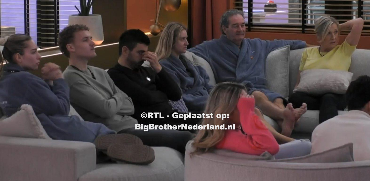In spanning wachten de bewoners af, de muziek klinkt en als eerste verschijnt Rob in beeld, hij was eerder al genomineerd. Mooie man he zegt Rob als hij zijn foto ziet. De volgende genomineerde is Jacqueline. Ik wist het zegt ze. En de laatste genomineerde die in beeld verschijnt is Jason. Die hakt er even in merkt Rob op. Jason wil opstaan maar Ail wil graag dat iedereen even blijft zitten. Mochten er mensen zijn die uitleg willen ben ik daar altijd bereid voor. En als er mensen zijn die achter mijn rug om iets willen zeggen wil ik dat ze recht tegen mij zijn. Rechtuit en meer zeg ik niet. Ook als er mensen zijn die uitleg willen waarom ze niet genomineerd zijn ben ik ook altijd bereid om uitleg te geven. Geloof me of niet, mijn hart gaat tekeer. Ik ben oprecht en dit is niet het fijnste van dit experiment. Ik heb er twee dagen wakker van gelegen. Meer kan ik niet zeggen, of heb ik ook niet te zeggen. Ik wil de uitleg individueel geven, ik heb argumenten. Helemaal goed vriend zegt Jason, Jacqueline vindt het helemaal prima. Jason en Rob staan op en Rob zegt derde keer vriend. We doen nog een rondje voegt Jason eraan toe. Ali blijft op de bank zitten en lijkt het moeilijk te hebben. Chayron gaat er bij zitten, het was niet makkelijk. En zeker niet voor die jongen naast mij legt Ali uit. Maar er zit een reden achter. Chayron weet wel waarom hij het gedaan heeft. Ik denk dat hij mij wel gaat begrijpen maar het is toch zwaar voor hem zegt Ali. Ik had hem beloofd er niet op te zetten maar dit is een andere bedoeling. Omdat hij het sterkste is op dit moment. Hij heeft vorige week tegen Michelangelo en Danny gewonnen, twee keer boven Rob uitgestoken. Ik moest een sterke speler kiezen. Dat is natuurlijk voor jezelf antwoordt Chayron. Ik voelde het gelijk dat je Jason erop zou zetten. Ik voelde dat ineens. Het is uiteindelijk jou eigen keuze en zolang jij erachter staat boeit het niet. Je speelt je eigen spel.