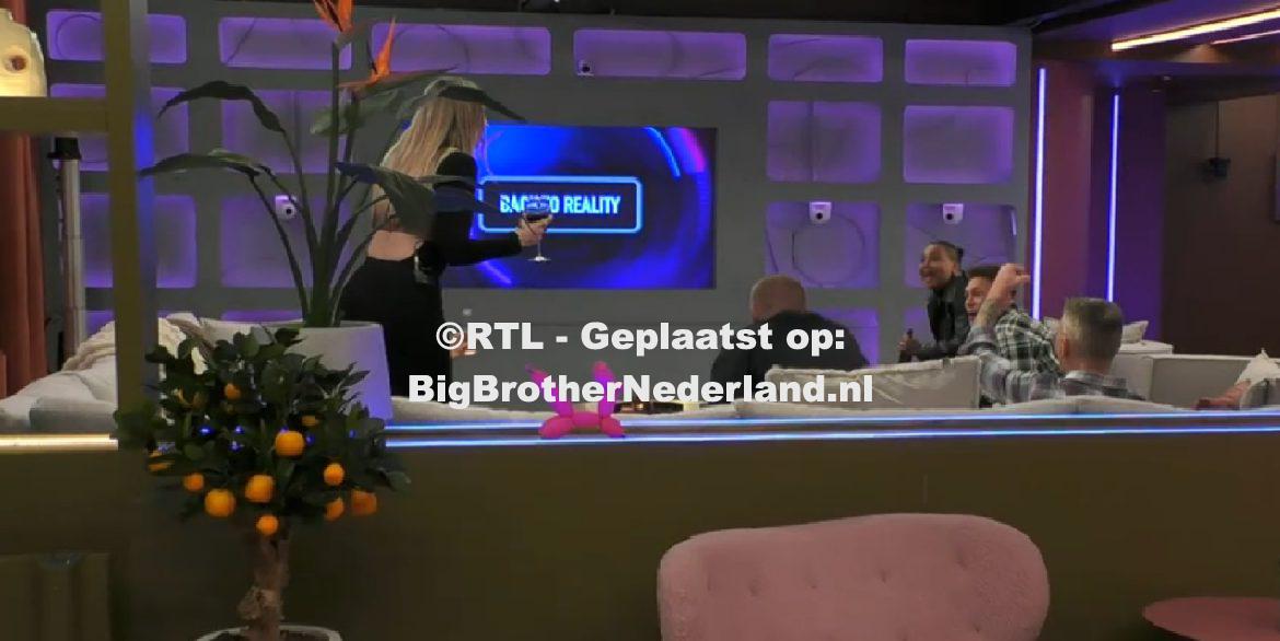 Gisteren tijdens de liveshow werd bekend dat Ali Big Brother moest verlaten. Ook werd er al gemeld dat er een feestje aan zat te komen. Big Brother sprak de groep dan ook toe. Jullie hebben met zijn zessen de halve finale gehaald en om dat te vieren staat er iets lekkers voor jullie klaar in de voorraadkamer. Er staan wat drankjes en lekkere hapjes klaar. Nog wat later maakt Big Brother het thema van deze week bekend. Op het scherm krijgen ze een video te zien. Dit experiment duurt al 72 dagen vertelt Big Brother. Ik zie en hoor alles, er zijn geen geheimen voor mij. Ik ken jullie beter dan jullie jezelf kennen. Tijdens deze 72 dagen is er van alles gebeurt. In jullie eigen wereld maar ook in de buitenwereld. Ik ga jullie stap voor stap meenemen deze week. Het is back to reality week.