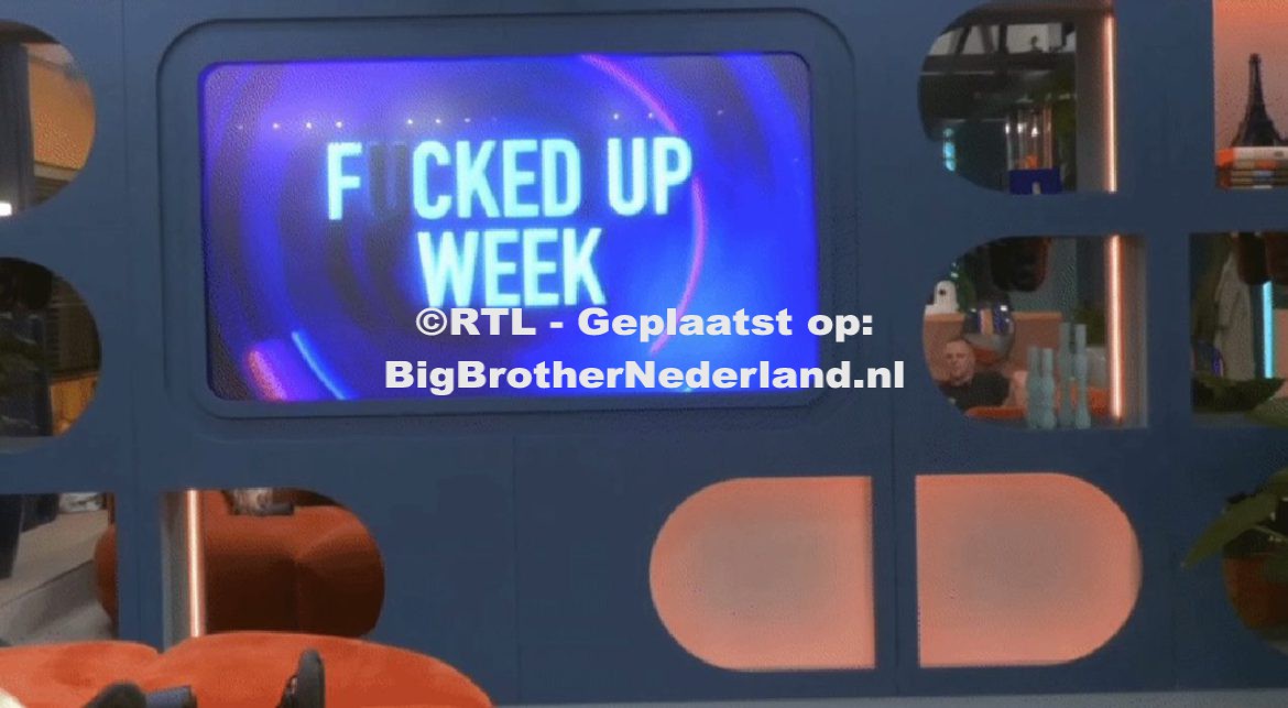 Als iedereen zit neemt Big Brother het woord. De eerste week in het huis zit erop. Ik hoop dat jullie al wat hebben kunnen wennen aan het leven hier. Aan de camera’s, het afgesloten zijn van de buitenwereld, het leven in duo en aan elkaar. Tijdens de week die komt zullen jullie wel een tandje moeten bij steken. Want alles wordt anders. Het is de komende week f*cked up week. Wat is dit reageert Lenie en Tyron vraagt zich af of ze niet meer informatie krijgen. Nee antwoordt Randy, hier moet je het mee doen. Het was al f*cked up grapt Tyron, de rest lacht. Morgen worden we slecht wakker man merkt Randy op. Tom denkt op zijn beurt dat ze in de nacht ook wakker moeten worden. Ik vond het nu al een f*cked up week zegt Danny op zijn beurt. Alice besluit uiteindelijk naar bed te gaan. En Lenie denkt dat het een hel gaat worden, bereid je maar voor. De lampen worden gedimd in het huis en de groep gaat uiteindelijk slapen.