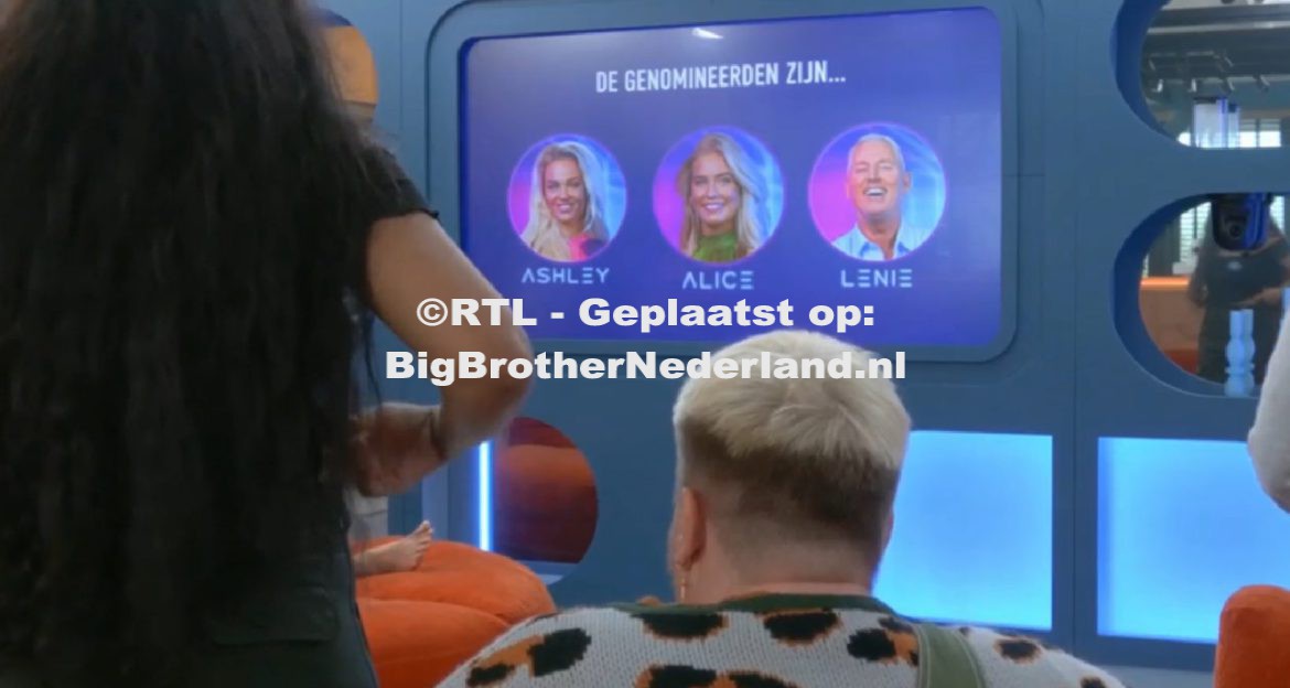 De bewoners in het huis moeten lang wachten maar dan laat Big Brother weten dat de bewoners in het huis naar de woonkamer moeten komen. Daar wordt bekendgemaakt wie definitief de genomineerden van deze week zijn. Als eerste verschijnt Ashley, gevolgd door Alice en als laatste Lenie. De bewoners in het huis weten niet wat ze zien, er is volop verbazing. Ze zijn erg benieuwd wat er gebeurd is. Niet lang daarna komen Tom, Ronahi, Ashley, Alice, Lenie, Doriana en Tyron weer terug in het huis.