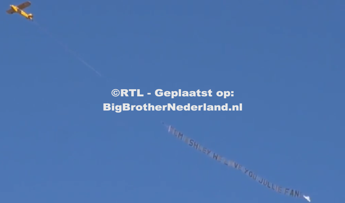 De bewoners gaan buiten kijken en Danny denkt dat het misschien wel voor Tyron is. Er wordt omhoog gekeken en daarna wordt het vliegtuig gespot. De boodschap zien ze het nog niet maar wel dat het een flinke boodschap is. Dit jaar is het jaar van de vliegtuigen grapt Danny. Al snel wordt de boodschap gelezen: “Tom Ashley We love you jullie fans”. Oh my god schreeuwt Ashley als ze Tom een knuffel geeft. Wat gaaf zegt Ashley blij. Ashley en Tom krijgen knuffels van hun medebewoners. Dit had ik echt niet verwacht zegt Ashley, dit is zo leuk! Ik zou hier zo graag een foto van willen maken merkt ze lachend op. Ik kan het niet geloven. Tom krijgt het ondertussen even moeilijk en wordt wat emotioneel. Alice geeft hem een knuffel. Ik weet niet wat ik meemaak zegt Ashley terwijl ze haar handen voor haar mond slaat. Hoe leuk is het dat we samen in de lucht hangen zegt ze tegen Tom. Tom denkt dat de fans contact hebben gemaakt omdat het samen is. Je zou denken dat ze vandaag iets voor Sabeau, Ty en Jimmy iets doen. Ik vergeet het mijn leven lang niet meer merkt Ashley op. We love you to, dit is echt een heel mooi cadeau. Tom maakt ondertussen een hartje naar de camera. De twee blijven nog even kijken totdat het vliegtuigje weer wegvliegt. De dag van Tom en Ashley kan niet meer stuk!