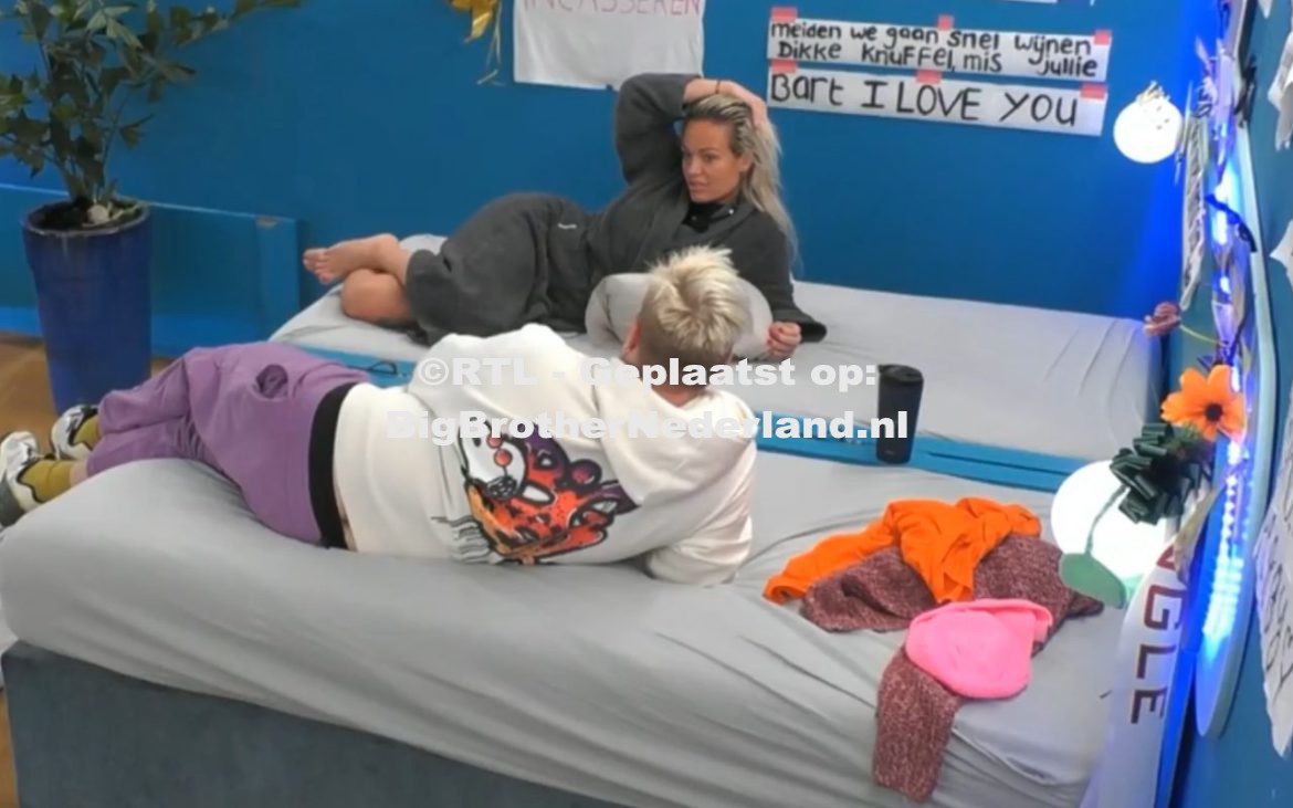Wat is dan de reden dat je anders naar mij doet en de rest normaal benadert vraagt Ashley. Jimmy antwoordt zijn rechtvaardigheidsgevoel. Ik wist ook dat er Nederlanders op gingen staan. Het gaat mij er niet om dat ik erop sta het voelde voor mij persoonlijk. Dan is de ruimte hier voor mij te klein. Normaal gezien spreek je elkaar een paar dagen niet en ga je weer verder en dat kan hier gewoon niet. Waar komt het vandaan dat je denkt dat ik persoonlijk op jou wil vraagt Ashley. Jimmy antwoordt dat dat hem ter ore is gekomen door verschillende kanten. Ik heb nu ook wel geleerd dat ik dit naast me moet neerleggen. Ashley snapt het stukje persoonlijk op hem gaan niet. Dat Alice niet gelukt is en de pijlen nu op mij zijn gericht legt Jimmy uit. Open je ogen kom op antwoordt Ashley. Ik ben met mijn muts op naar binnen gegaan, drie man genomineerd en ik heb hem bij jou afgedaan. Omdat ik het niet leuk vind om op jou te gaan. Je moet echt je ogen openen, echt waar. Je moet niet alles voor waar aannemen. Doe ik ook niet antwoordt Jimmy, het is gewoon alles bij elkaar. Ik had het ook eerlijk tegen jou moeten zeggen. Ik ben gewoon de eerste dagen van deze week niet sterk geweest. Ik heb je geholpen en neem het voor je op waar ik kan benadrukt Ashley. Alleen maar omdat ik vind dat je onrechtvaardig behandeld wordt. Het is gewoon moeilijk hier geeft Jimmy toe. En Ashley verzekert dat ze op hem stemt voor het spel. Niets persoonlijk, anders zou ik ook niet leuk met je doen. De twee praten nog enige tijd door en geven elkaar daarna een knuffel. Maak je niet druk benadrukt Ashley, het komt allemaal goed. Is het niet hier dan is het buiten.