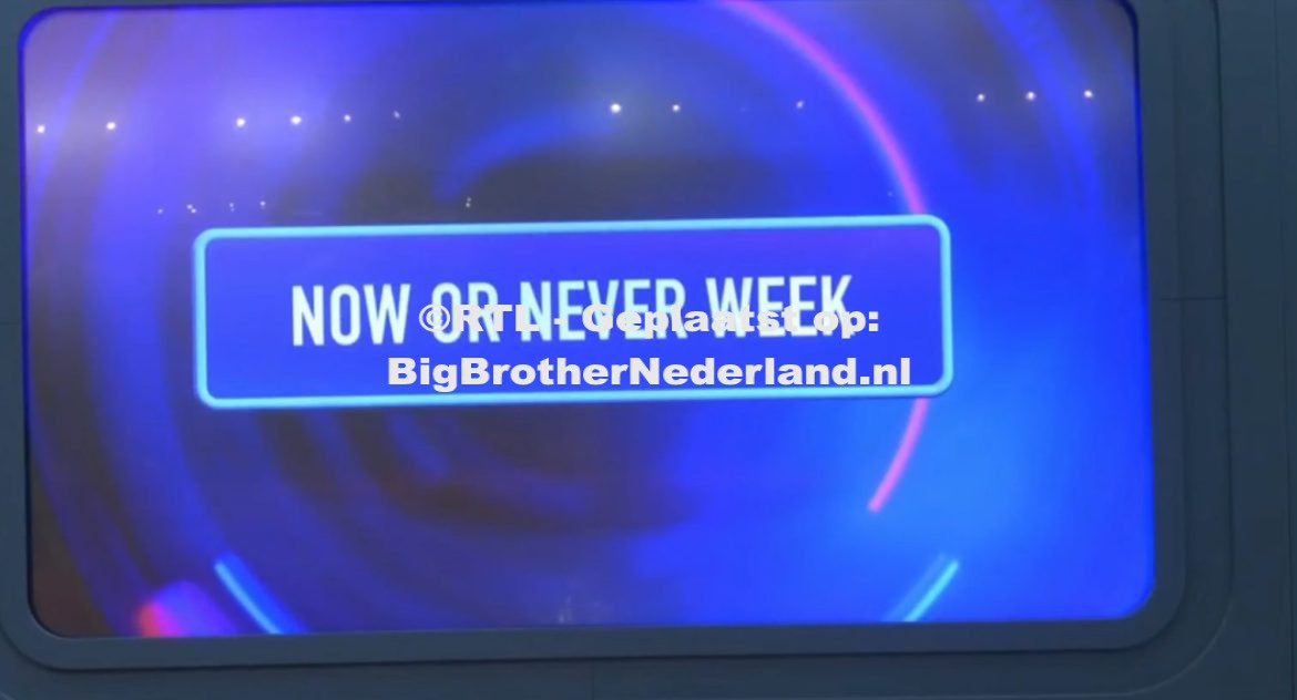 Zodra iedereen zit neemt Big Brother het woord. Bewoners, dit avontuur is niet gemakkelijk. Week na week wordt jullie groep kleiner en zien jullie vrienden door de draaideur verdwijnen die nooit meer terugkomen. Maar naast vrienden zijn jullie natuurlijk ook elkaars concurrenten. Dus wees blij dat iemand anders vertrekt en niet jij. Maar jullie zijn er nog niet. Deze week verwacht ik van jullie meer dan ooit een totale inzet. Op zowel fysiek als mentaal vlak. Ik ga jullie door en door testen. En voor dillema’s stellen. Want ik wil nu echt kijken wie het verdient om de halve finale te halen. Denk goed na over alles wat je doet deze week. En vergeet niet, je speelt het spel alleen. Welkom in now or never week.
