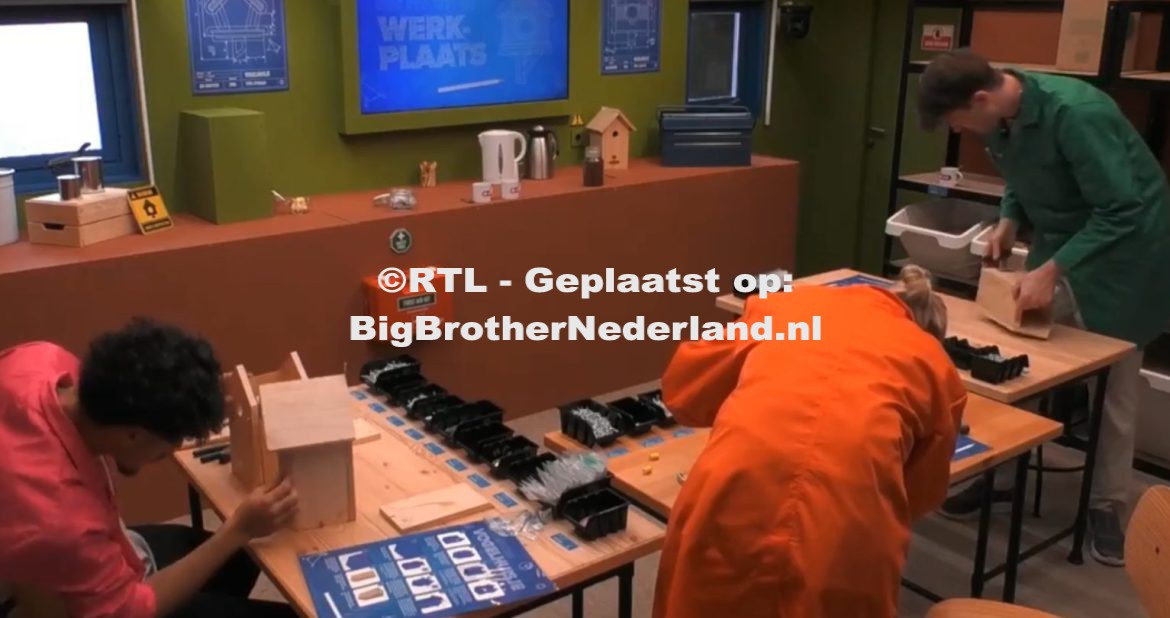 Als Jolien, Axel en Mattheüs in de werkplaats arriveren willen ze als eerste thee en koffie zetten. Maar Big Brother heeft eerst nog het een en het ander uit te leggen. Ze moeten net als Jeffrey, Niels en Jordy huisjes maken volgens de handleiding. Elk vogelhuisje wat af is levert 5 euro op. Axel is handig en heeft binnen no time een vogelhuisje klaar. Mattheüs en Jolien hebben er meer moeite mee. Als Jolien het vogelhuisje bijna af heeft dan komt ze erachter dat er een scheur in de voorkant zit. Big Brother keurt het vogelhuisje af en ze moet weer opnieuw beginnen.