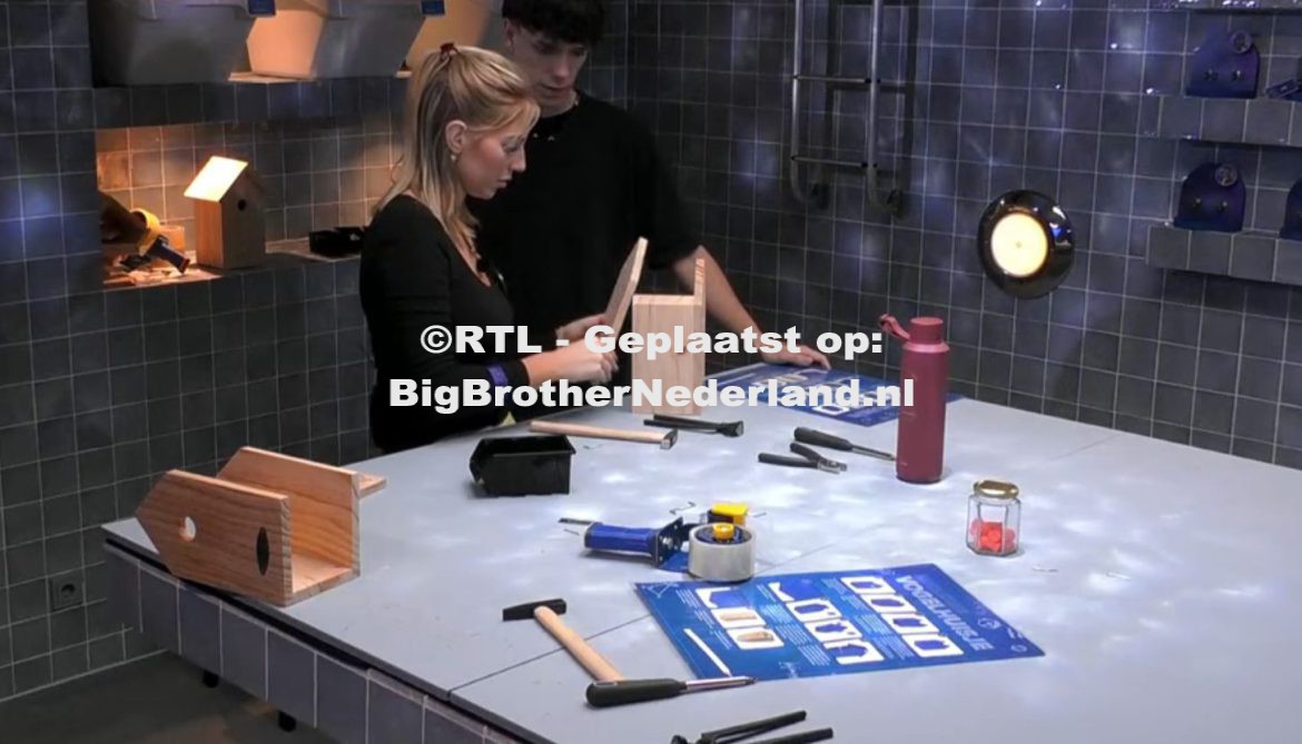 En dan meldt Big Brother zich. Bewoners begint hij. Eerder deze week hebben jullie fanatiek gewerkt voor julie bedrijven en voor de vogelbescherming. Omdat het jullie zo goed is bevallen wil ik jullie vandaag opnieuw de kans geven om een bijdrage te leveren aan de natuur. In de decision room mogen jullie zo meteen met maximaal twee bewoners tegelijk vogelhuisjes bouwen. Het bouwen ervan is in dit geval niet voor geld voor je eigen bedrijf, het is puur en alleen voor de vogels en de vogelbescherming. Zorg ervoor dat er continu twee bewoners aan het werk zijn. Tot ik zeg dat jullie kunnen stoppen. Let op, ook deze vogelhuisjes zullen verkocht worden aan jullie fans. En het is dus belangrijk dat ze allemaal van hoogwaardige kwaliteit zijn. Jullie mogen elkaar helpen en er is geen tijdslimiet. Veel succes en veel plezier!