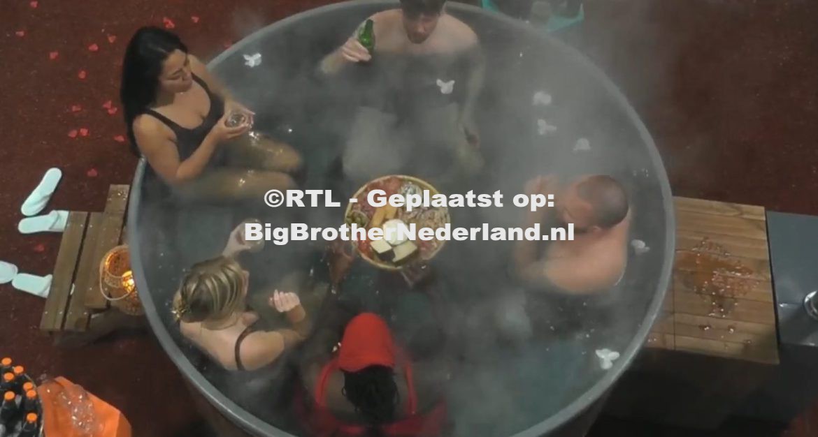 Daar staan twee hottubs klaar maar dat is nog niet alles. Er zijn hapjes en ook lekkere drankjes. Er staat fris, wijn maar ook bier. Het groepje kan hun geluk niet op, Axel krijgt knuffels. Big Brother heet hen welkom in de spa. Leg de zenders dadelijk op de sokkels naast de hottub. Geniet ervan! Het viertal proost op dit mooie moment. Na enige tijd zit de verrassing er weer op, het is weer tijd om terug te gaan naar het huis. Daar vertellen Axel, Jane, Elsa, Jolien en David waar ze allemaal van genoten hebben. De avond van het viertal kan niet meer stuk. Maar dan klinkt er ineens een geluidssignaal en zijn de genomineerden van deze week al bekend…